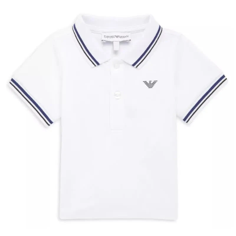 Baby boys white polo shirt by Emporio Armani, made in soft cotton piqué. This short-sleeved top has navy blue and black stripes on the ribbed collar and cuffs. Instantly recognisable, the signature black rubberised Eagle logo can be seen on the chest.