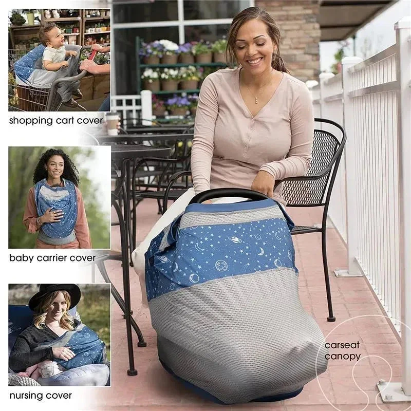 This versatile cover will make sure you have the coverage you need while out and about with baby. This single cover is an infant car seat canopy, a nursing scarf, an infant stroller cover, a shopping cart cover, a highchair cover, and a baby carrier cover. It also packs up small in an integrated pouch to easily toss in your purse or diaper bag. Dual-sided, you have options while on the go. Choose from its breathable mesh side, or a UPF 50+ solid knit side for more coverage. The cover is designed with two snaps to give you a custom fit while using it as a nursing scarf and to give a secure fit when using as an infant car seat canopy. The yoga-inspired, quick dry fabric is stretchy, comfortable and durable for wherever parenthood takes you. Shield baby from weather and unwanted touch while out by using the Boppy Multiuse Cover as an infant car seat canopy. Position the mesh side front for breezy comfort, or the solid knit side to decrease distractions. The canopy snaps around the car seat handle so it stays secure and fits snuggly around your car seat. When you are using it as a nursing scarf, you will have a breathable mesh at your back and the UPF 50+ knit at your front for protection, privacy and to reduce distractions for baby. There is even a mesh. Peek Panel on the top of the knit side so you can see baby while breastfeeding. The two snaps allow you to size the cover for a more custom fit. Use in sash or poncho position. Have a barrier for baby when in a restaurant highchair or a shopping cart. The stretch fabric makes it easy to fit multiple sized seats. Just be sure to pull through the safety restraint on the chair or cart. Keep baby cozy on brisk walks by using the 4 and More Multiuse Cover as a baby carrier cover. Simply drape it around your neck and stretch it around the bottom of your carrier for added warmth. These days we are all being a bit more careful. This cover is there for you to add a little coverage to your outings with baby.
