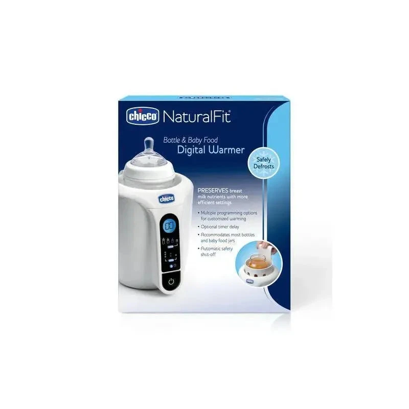 The NaturalFit® Digital Bottle and Baby Food Warmer from Chicco preserves nutrients with its multiple, efficient warming options. Safely bring breast milk and baby food up to temperature while preserving precious nutrients with settings that meet your needs. First choose a bottle/jar size and then choose a starting temperature: frozen, refrigerated, or room temperature. In a few short minutes you’ll hear the “meal-ready” alert that sounds when warming is complete. A digital countdown display allows you to monitor the progress of your warming bottle, and the automatic safety shut off kicks in when the warmer is not in use. Other convenient features include an insert that makes it easy to get small baby food jars in and out of the warmer.