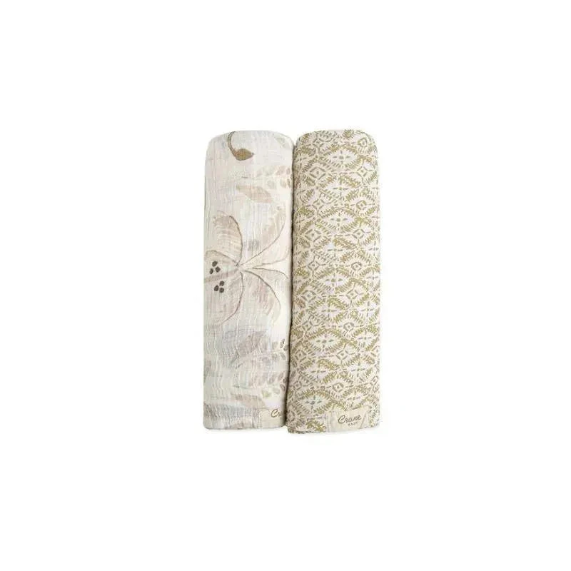 SIZE: Two 47″ x 47″ pre-washed cotton muslin swaddle blankets in beige and safari animal prints