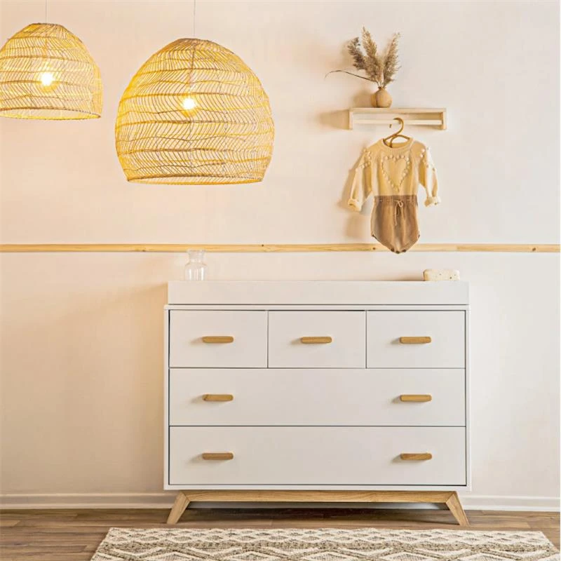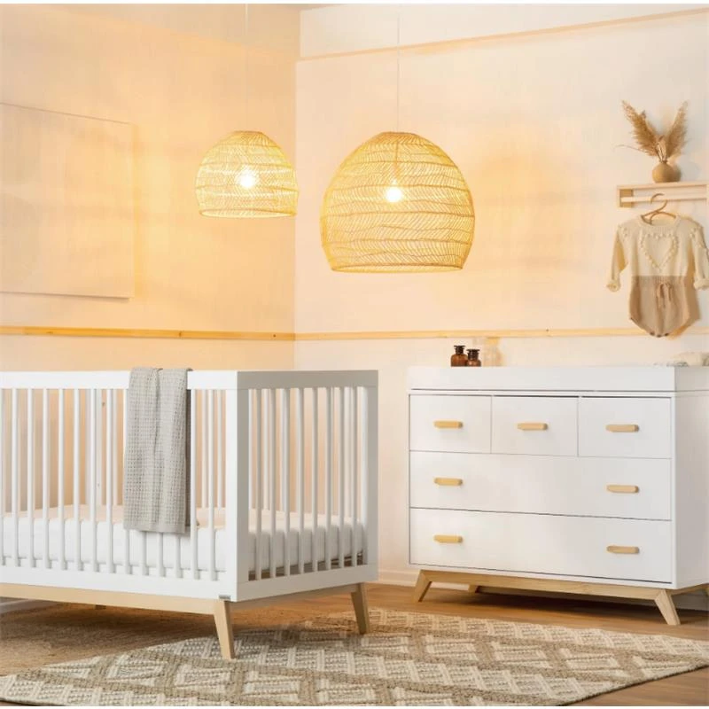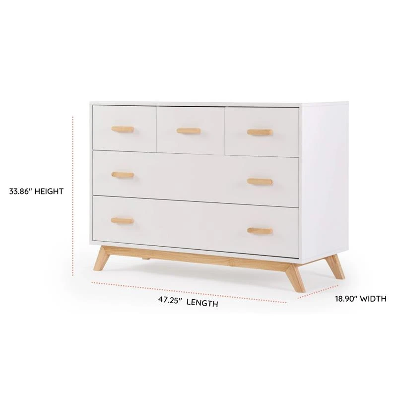 The modern 5-drawer dresser combines classic style with functional design, making it a perfect complement to any nursery or bedroom. Its timeless aesthetic pairs beautifully with the Soho 3-in-1 Crib or stands out as a stylish statement piece on its own. Crafted for safety and stability, this dresser features sturdy angled legs, solid wood handles, and forged steel support, ensuring it remains a reliable fixture in your home.