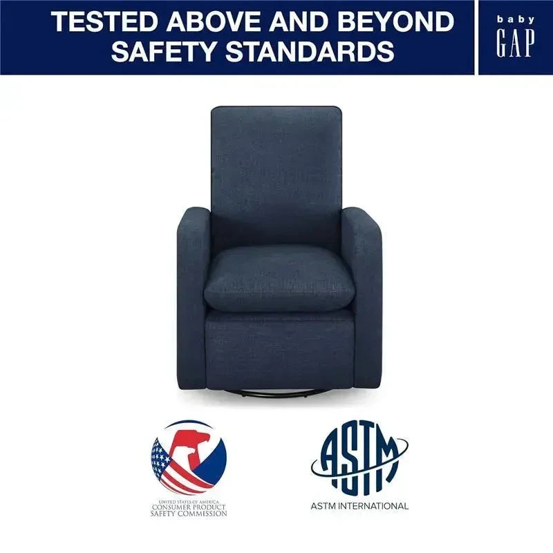 The babyGap Cloud Recliner with LiveSmart Evolve Fabric brings a modern silhouette, clean lines and plenty of cozy comfort to the nursery. The recliner features an easy-to-reach pull tab reclining mechanism that offers two recline positions (footrest up only and footrest up with back reclined), plus it swivels and glides with a smooth motion, so you won’t disrupt your little one’s sleep while you get comfortable. The included lumbar pillow provides additional support. The perfect combination of performance and suitability, the babyGap Cloud Recliner is upholstered in LiveSmart Evolve fabric that is durable, stain-resistant, and sustainably designed using fabric made from recycled plastic bottles. LiveSmart Evolve will keep the recliner looking and feeling beautiful while helping to divert as many as 30 plastic bottles from waterways and landfills per chair. Create a more sustainable future for your whole family with the babyGap Cloud Recliner.