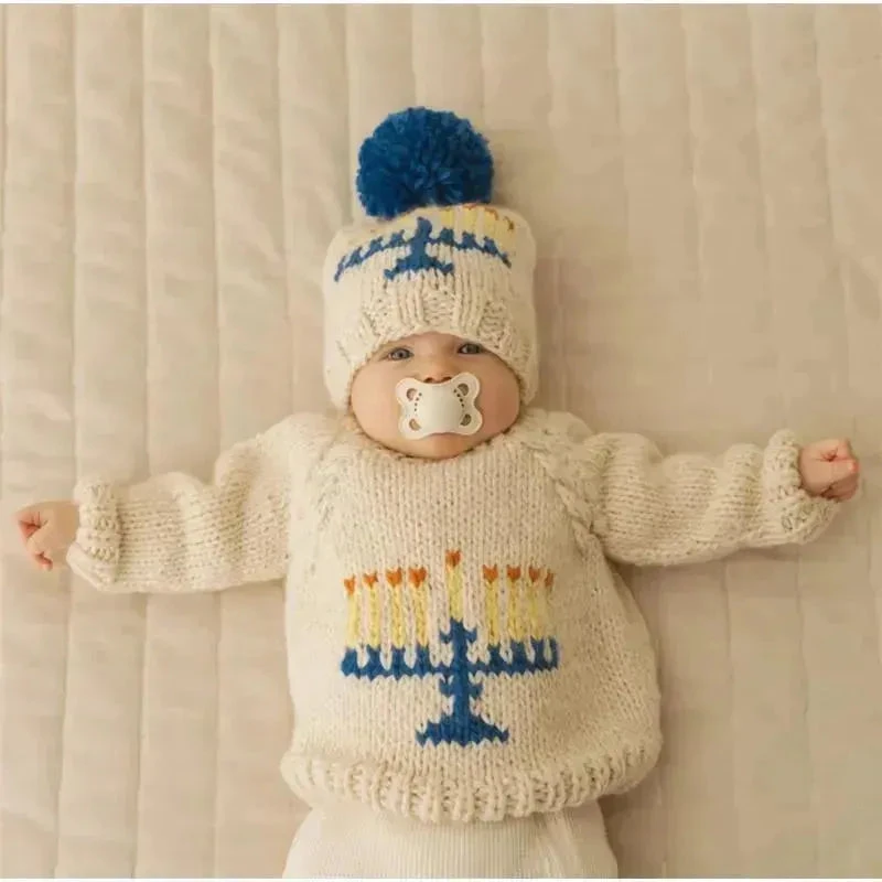 A handknit hat in chunky Natural hued yarn with a Menorah design in blue with yellow candles and orange flames. Perfect for Hanukkah celebrations. We have a matching sweater too!