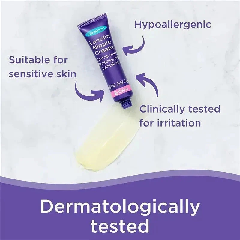 Each Lansinoh nipplecream tube contains 0.25 ounces (or 7 grams) of pure lanolin. This nipple butter is safe for nursing and dry skin. To use, soften a pea-sized amount of breastfeeding nipple cream between your fingers and apply to the entire nipple area. Our nipple cream lanolin can be applied before showering to protect sensitive nipples. With this cream for nipples breastfeeding moms are able to soothe their sore nipples from nursing.