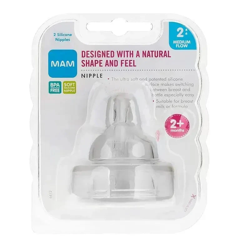 Mam Bottle Medium Flow 2 pack nipples are Silicone nipples to use with the Ultivent Mam Bottles. This orthodontic nipple is made of ultra soft silicone and encourages baby to use a natural sucking action, similar to breastfeeding.BPA free.