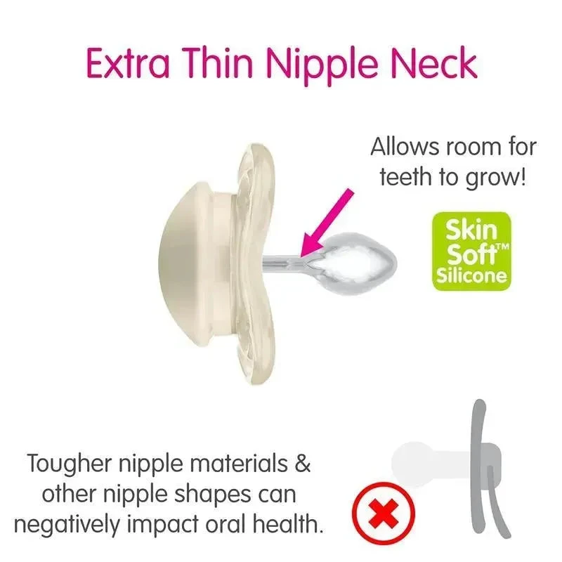 FLEXIBLE SHAPE FOR 0-6 MONTH BABY : The nipple on these pacifiers for babies is 60% thinner and 4x more flexible than average, exerting less pressure on the mouth in order to avoid jaw deformations.