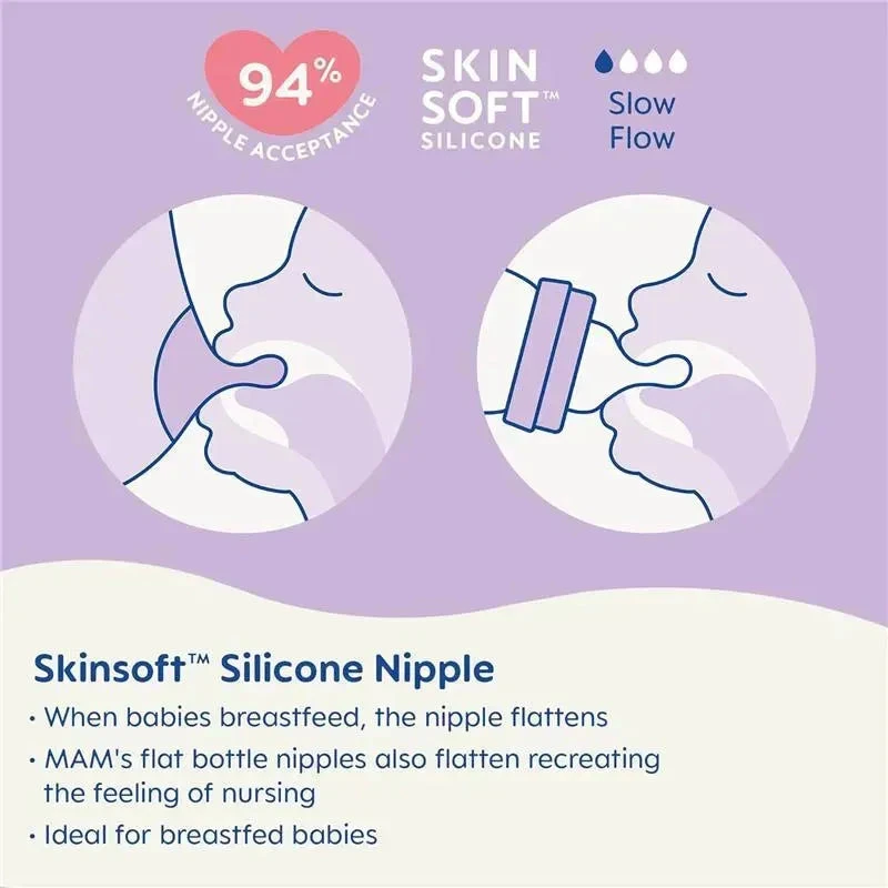 GREAT FOR BREASTFEEDING MOMS – 94% of babies accept our SkinSoft nipple which mimics breastfeeding and supporting healthy jaw and teeth development. making these MAM bottles, pacifiers & nipples the best for a breastfed baby.