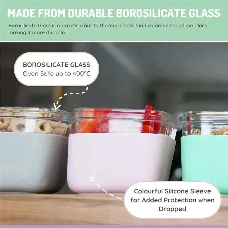 AIRTIGHT AND LEAKPROOF LIDS: The silicone seal locks in freshness and prevents the glass container from spilling and making a mess in your diaper bag or lunch box. Great for wet and dry food.