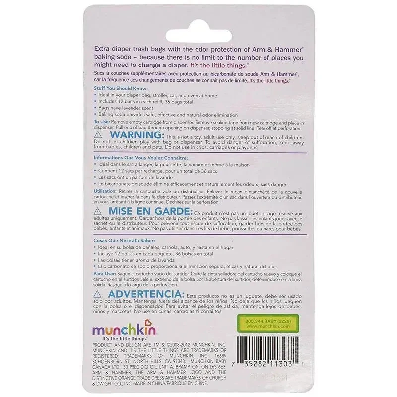 Arm and Hammer bag refills make diaper disposal easy wherever you are. Compatible with the munchkin Arm and Hammer diaper bag dispensers, these convenient refills are great for use at home or on the go. Each bag is infused with Arm and Hammer baking soda for safe, effective and natural odor elimination. Additionally, bags are lightly scented with lavender. Bags are large, durable and easy to separate.