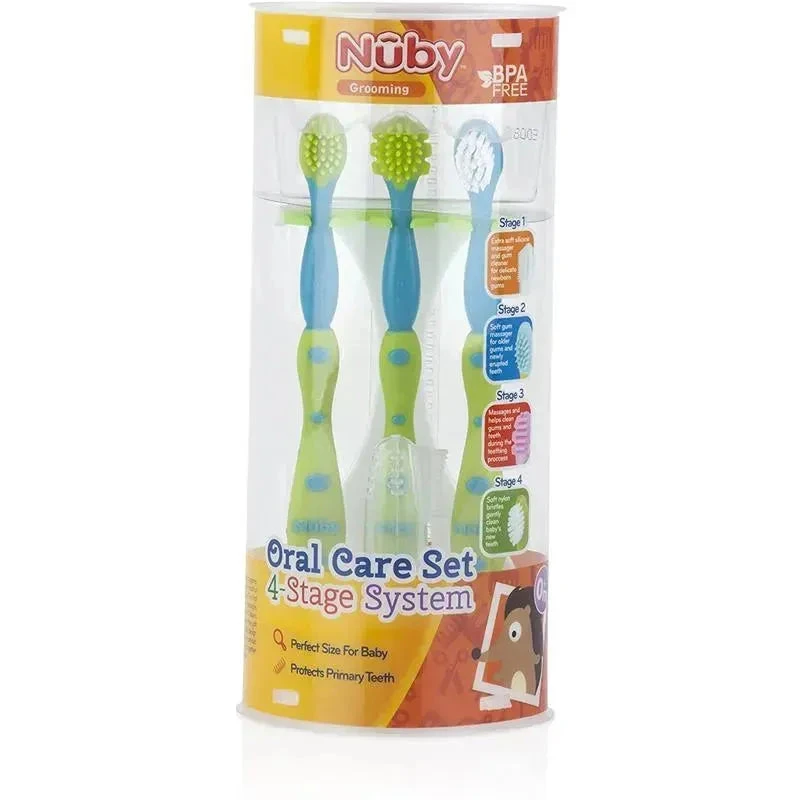 Stage 4: The Nylon Brush is for babies with teeth. For effective brushing action, the nylon bristles are tufted. To be gentle on the child’s gums, the bristles are soft and flexible. To make it easy for the child to brush, the brush is child sized.