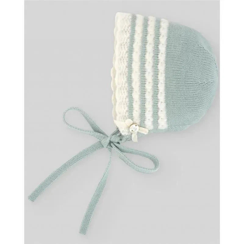 Knitted bonnet with combined two-tone design and wavy finish. Closure with matching tie. Adjustable cords for greater comfort.