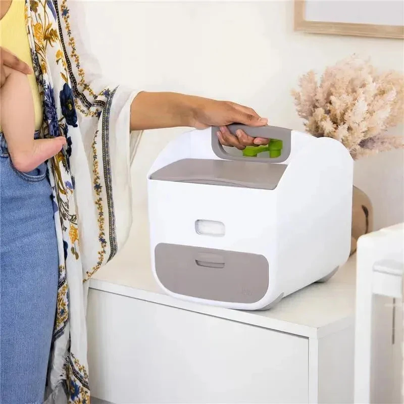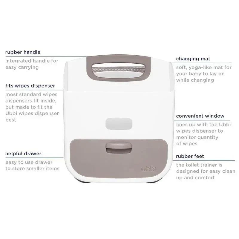 Ubbi Diaper Storage Caddy and Changing Mat provides parents with convenience, durability and accessibility by having all the diapering supplies organized in one portable storing unit. Made of sturdy plastic, the Ubbi diaper caddy has two main compartments for diapers and wipes, with a drawer for smaller items and a fitted space that includes a comfortable and easy-to-clean changing mat. The caddy also has an integrated handle and non-skid rubber feet allowing it to be carried around or stay safely in one place. While the Ubbi diaper caddy can store most disposable wipes dispensers, it was cleverly designed with a window that matches the Ubbi branded wipes dispenser’s window for parents to know when they are running low on wipes. PVC, BPA & Phthalate free. Ubbi wipes dispenser sold separately. About us: Ubbi is a globally recognized brand, designing innovative and creative products with parents and children in mind. Under the Ubbi name, you will find unique, quality products that are easy to use, and simplify parents’ lives while keeping babies happy and safe as can be. Our steel, odor locking diaper pail was a first on the market in 2011, and has become our flagship item. With the same customer focused philosophy and innovative design capabilities, we have expanded into a variety of product categories: feeding, modern and trendy on-the-go items, bath toys and functional accessories. From concept to final creation, the Ubbi team works together every step of the way to bring the best in design and value.