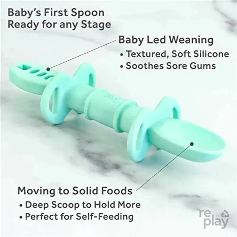 Two Spoons in One: The Dip ‘n’ ReDip Utensil has a flathead spoon on one end and a regular spoon on the other to encourage self-feeding at every stage