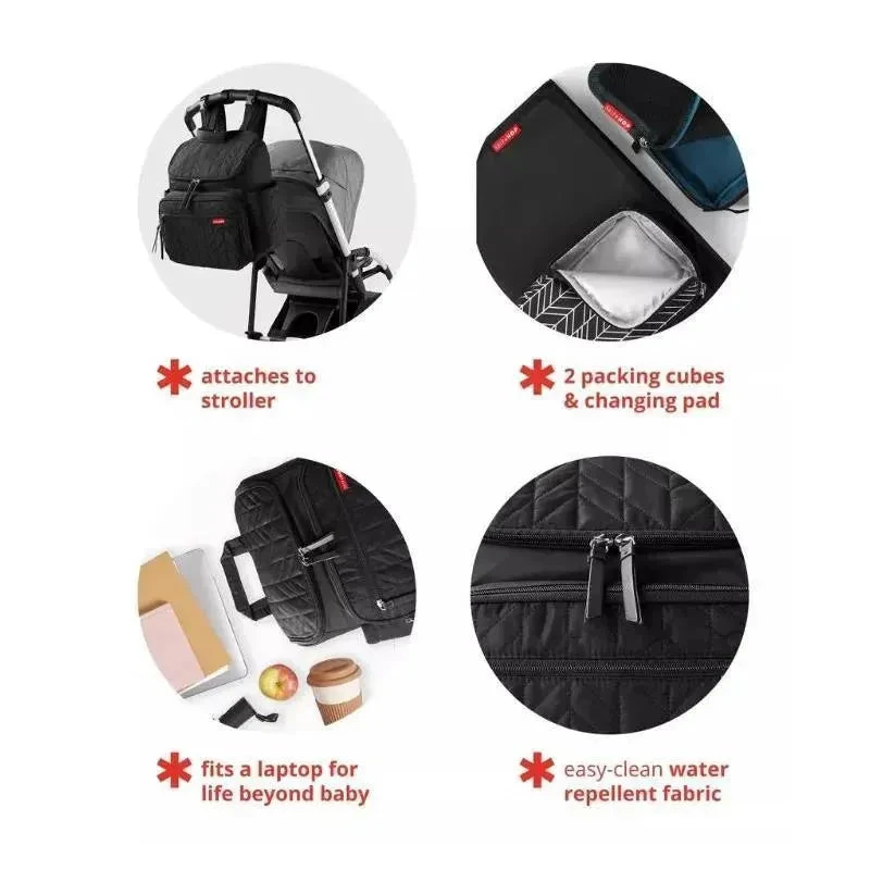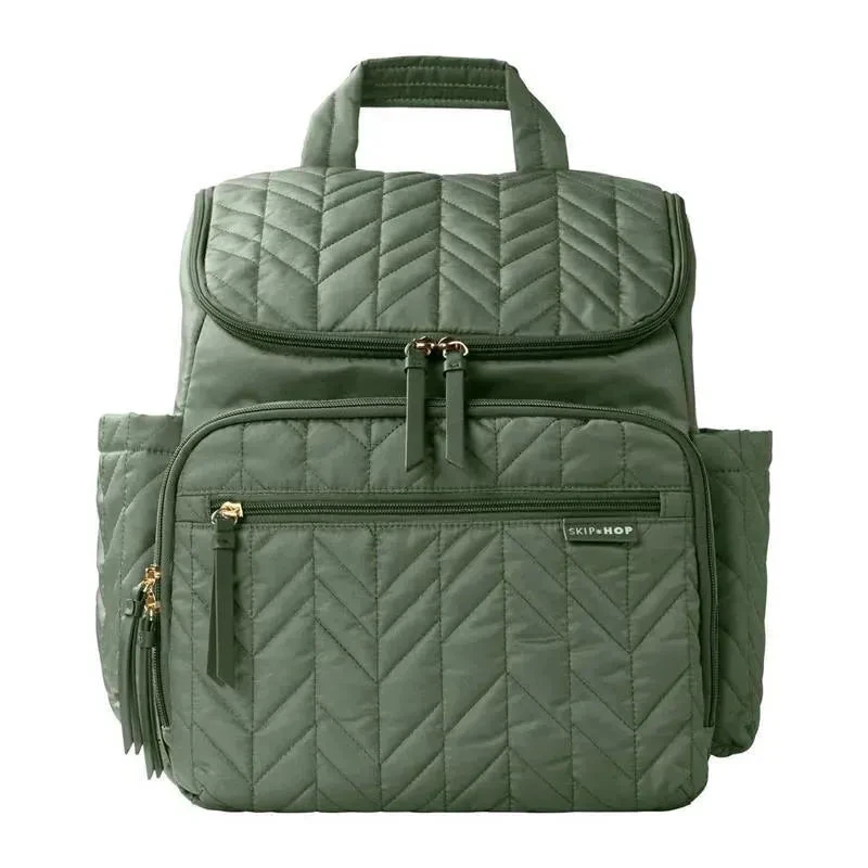 Our lightweight, quilted Skip Hop Forma Sage Diaper Bag Backpack offers hands-free ease and special packing cubes for baby’s gear. The spacious interior fits everything from snacks to spare outfits and the extra wide opening makes it easy to pack and grab essentials in a pinch.