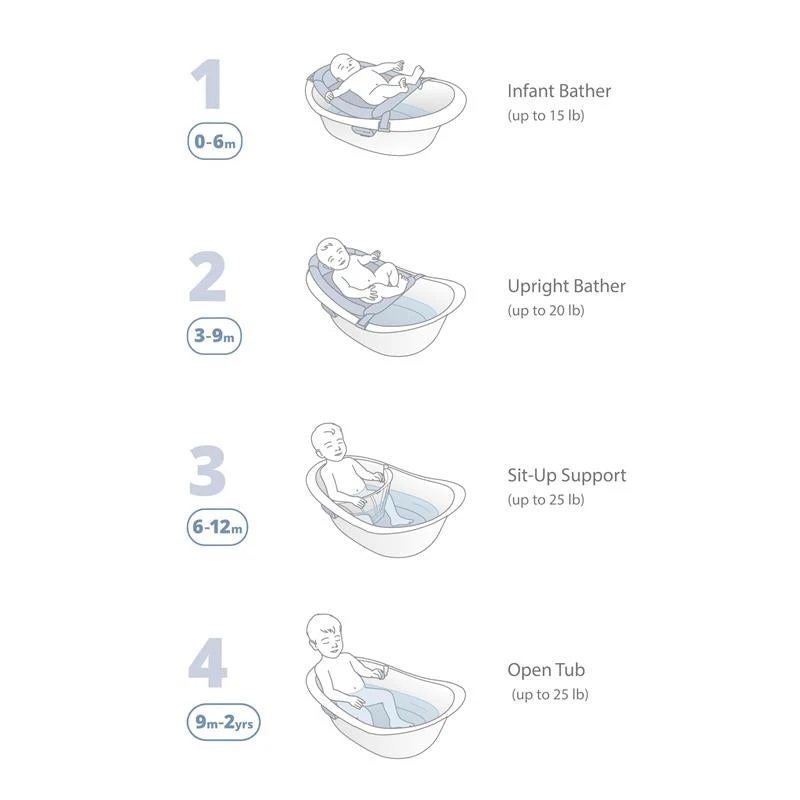 Tub grows with baby through three stages: Stage 1: Newborn (0-3 months; up to 15 lbs); Stage 2: Infant (3-6 months; up to 20 lbs); Stage 3: Sitters (6+ months; up to 25 lbs)