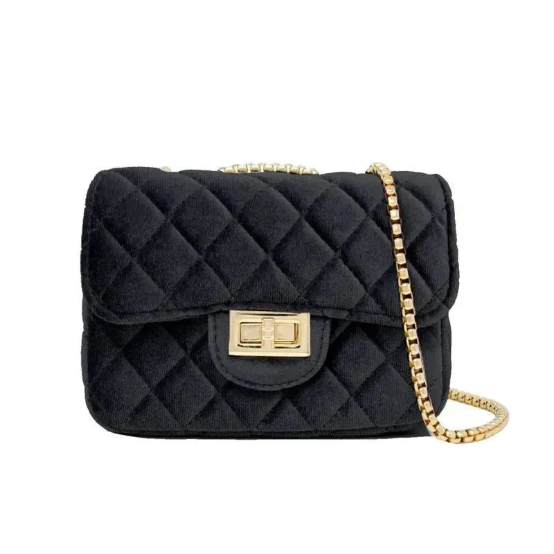 The large classic suede bag is a large version of our classic tweed bags. Great size for tweens or kids who love a larger size bags. The chain is designed to be worn either crossbody or shoulder.